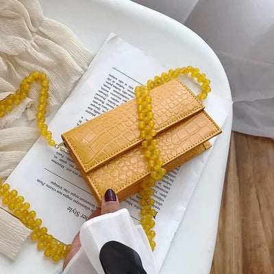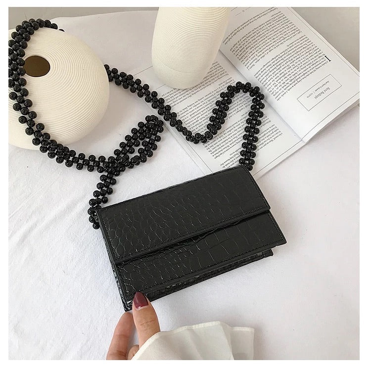 Dare to get noticed with this mini flap bag. This compact handbag features a beaded clustered long strap that lets everyone know you have style, and it has just enough room to carry your small accessories!